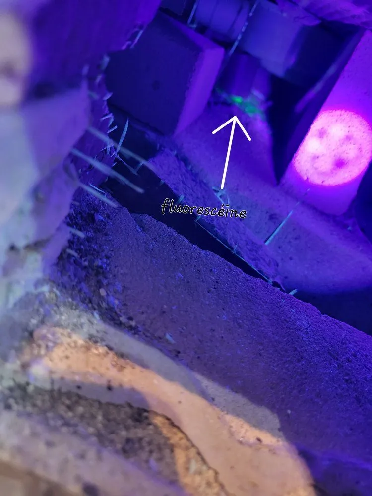 - Nous avons effectué la mise en eau du receveur de douche à l'aide de fluorescéine - Fuite détectée.
