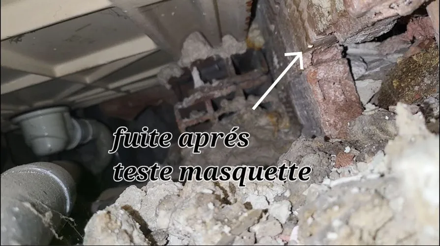 - Nous avons réalisé la mise en eau de la masquette située dans la douche - Fuite détectée.